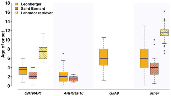 Mean age of onset in the LPPN-affected dogs was investigated for a subset of 770 dogs with detailed health information from three breeds (596 Leonbergers, 28 Saint Bernards, and 146 Labrador retrievers) and showed a marked difference between the cases depending on the different underlying genetic causes (Figure 3). The average age of onset of clinical signs in the limited number of dogs homozygous for the herein described CNTNAP1 variant was 3.4, 2.1, and 7.5 years in Leonbergers, Saint Bernards, and Labrador retrievers, respectively. In comparison, the age of onset of clinical signs in the previously characterized ARHGEF10-associated polyneuropathy [8] was seen in Leonbergers and Saint Bernards with average ages of 2.2 and 1.6 years, respectively. Additionally, affected Leonbergers with the GJA9 frameshift variant [9] had average age of onset of their clinical signs of 6.2 years. Interestingly, the LPPN-affected Labrador retrievers that do not carry the herein identified CNTNAP1 variant and come from the GOLPP study [6] showed a higher average age of onset of 11.5 years (Figure 3). The difference in age of disease onset between the dogs with the identified CNTNAP1 variant and the cases without known disease-causing mutation was statistically significant in all three breeds (Leonberger p-value = 0.000001002, Saint Bernard p-value = 0.01681, Labrador retriever p-value = 0.002662). The difference between dogs with the CNTNAP1 variant and the ARHGEF10 variant was significant in Leonbergers (p-value = 0.002538) but not significant in Saint Bernards (p-value = 0.3095). The difference between Leonbergers with the CNTNAP1 variant and the GJA9 variant was statistically significant (p-value = 0.00000001797).