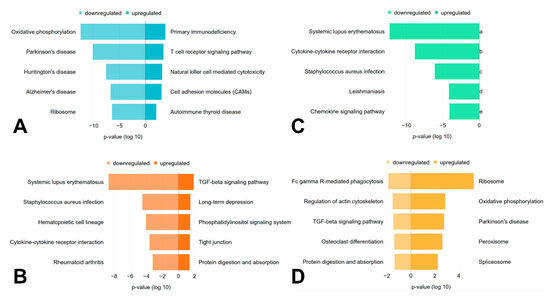 For samples with mutations in LMNA, immune pathways are upregulated, whereas the most significantly downregulated pathway is ‘oxidative phosphorylation’ (Figure 2A). Three of the five most significantly downregulated pathways for the samples with variants in RBM20 and TTN are shared (Figure 2B,C). The TGFβ signaling pathway is significantly upregulated in samples with mutations in RBM20 (Figure 2B) and significantly downregulated in samples with mutated PKP2 (Figure 2D). Furthermore, some pathways, like specific infection or disease pathways, are significantly regulated.