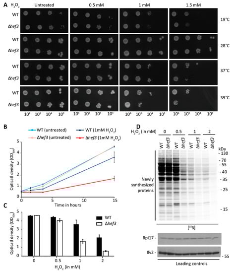 Deletion of the HEF3 gene sensitizes yeast cells to oxidative stress. (A) Serial dilutions of wild-type yeast cells and hef3Δ cells were grown for five days on solid medium with a fermentative carbon source (sucrose) that contained the indicated concentrations of H2O2 or were untreated at different temperatures. The growth test was repeated in three independent experiments. (B,C) Cells were grown at 28 °C in a synthetic defined medium that contained glucose to the logarithmic growth phase. (B) H2O2 (1 mM) was added, and optical density was monitored over time. The mean ± SD of at least two independent experiments is presented. (C) The indicated concentrations of H2O2 were added, and cell growth was monitored. The graph represents the optical density after 15 h of growth. The data are expressed as the mean ± SD. The experiment was repeated at least two times. (D) Cells at the logarithmic growth phase were incubated for 30 min with the indicated concentrations of H2O2, and newly synthesized proteins were simultaneously labeled with [35S]-labeled methionine. Total cell extracts were separated by SDS-PAGE and analyzed by autoradiography or Western blot using specific antibodies. The analysis was repeated in three independent experiments.