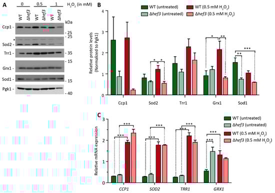 We initially found that cells that lacked Hef3p had lower steady-state protein levels of Sod2 (see also Figure 1B). We next investigated whether Hef3p influences the expression of proteins that are necessary for ROS detoxification upon oxidative stress. We treated wild-type cells and hef3Δ cells with 0.5 or 1 mM H2O2 and analyzed protein levels of ROS-detoxifying proteins in mitochondria (i.e., Ccp1 and Sod2) and the cytoplasm (i.e., Trr1, Grx1, and Sod1; Figure 5A). The changes in the protein levels in the course of the experiment were quantified and normalized to the expression of Pgk1p, which is not involved ROS defense, in wild-type and hef3Δ cells (Figure 5B). Under mild oxidative stress conditions (0.5 mM H2O2), wild-type cells tended to exhibit an increase in the levels of ROS-detoxifying enzymes compared to non-stressed conditions. This was especially observed for Sod2p, Trr1p, and Grx1p. In contrast, in hef3Δ cells, the levels of proteins remained lower compared to wild-type cells upon mild oxidative stress (i.e., Ccp1p, Sod2p, and Grx1p).