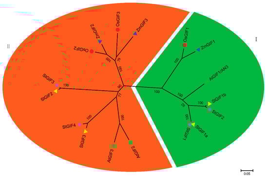 Phylogenetic relationship of GIF proteins. The unrooted tree was constructed using MEGA6 through the neighbor-joining method at 1000 bootstrap replicates based on the alignment of GIF protein sequences in Arabidopsis, rice, maize, potatoes, and tomatoes. The different markers before protein names stand for different plants. All these GIF proteins were clustered into two clades (I and II) in the phylogenetic tree.