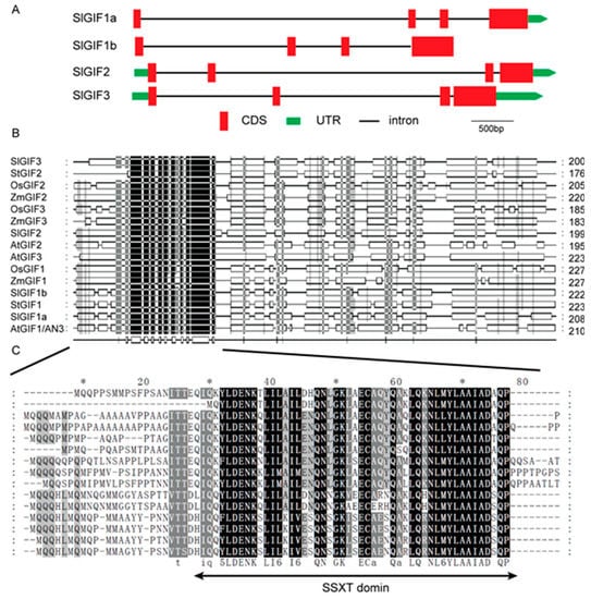 Structure and conserved motif analysis of the GIF genes. (A) The exon and intron structures of the tomato GIF genes. The gene structures of the SlGIF genes were illustrated using the Gene Structure Display Server (http://gsds.cbi.pku.edu.cn/) and the IBS software []. The red box and the green box represent the CDS and UTR, respectively. The solid line stands for the intron. (B) Motif analysis of the SlGIF proteins. The conserved motifs of all GIF proteins in this study were identified using ClustalX and GeneDoc software. (C) Detailed SSXT domains from the GIF proteins.