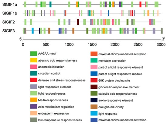 Identified cis-elements in the promoters of the SlGIF genes. The line represents the upstream of the GIF genes. Different colored rectangulars represent different cis-elements. The lengths of the promoters of SlGIF genes are 3 kb.