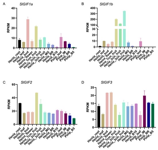 The RNA-Seq data of different tissues at various developmental stages of the fruit of the tomato cultivar, Heinz 1706, were accessed from the Tomato Expression Atlas database (TEA). Tissues including root, leaf, flower, flower bud, fruit at different sizes (1, 2, and 3 cm), mature green fruit, BR fruit, and fruit at 10 days after breaker were retrieved from the TEA database. In addition, the expression data for leaf, immature green fruit, BR fruit and fruit at 5 days after breaker were accessed from LA1589 (Solanum pimpinellifolium) [,]. The normalized expressions (RPKM) of SlGIFs were downloaded from the supplementary files [].
