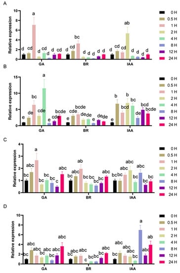 Expression profiles of SlGIF genes (GIF1a (A), GIF1b (B), GIF2 (C), and GIF3 (D)) under BR, GA, and IAA treatments. The numbers 0 H, 0.5 H, 1 H, 2 H, 4 H, 8 H, 12 H, and 24 H indicate the time after the treatment. The expressions of the treated plants were compared with those of the untreated plants after the normalization of values with an internal reference. The error bars represent the standard errors among three independent replicates, and the different letters above the bars indicate statistically significant differences at a 5% level of significance according to Tukey’s pairwise comparison tests.