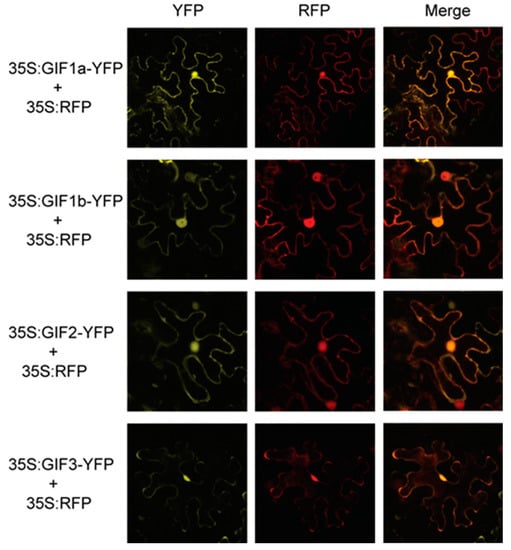 Subcellular localization of SlGIF– yellow fluorescent protein (YFP) fusion proteins. Tobacco leaves was infiltrated with Argobacterium tumefaciens (A. tumefaciens) containing a recombination vector (35S: GIFs-YFP) and a nuclear marker RFP (red fluorescent protein).
