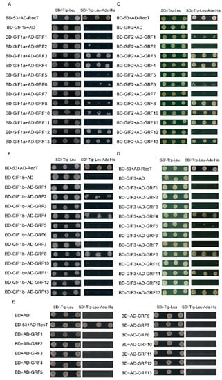 Interactions between GIF proteins and growth-regulating factors (GRF) proteins in a yeast two-hybrid assay. (A) GIF1a interacted with GRFs; (B) GIF1b interacted with GRFs; (C) GIF2 interacted with GRFs; (D) GIF3 interacted with GRFs; (E) the negative controls of GRFs. GIF proteins and GRF proteins were used as a bait and a prey, respectively, in different combinations. SD/-Trp-Leu was an SD medium lacking leucine and tryptophan. SD/-Trp-Leu-His-Ade was an SD medium lacking leucine, histidine, adenine, and tryptophan. BD was the pGBKT7 vector, and AD was the pGADT7 vector. Yeast cultures with transformed yeasts adjusted to have optical densities at 600 nm (OD600) of 1.0 and 2 μL yeast culture dilutions were spotted on SD/-Trp-Leu and SD/-Trp-Leu-His-Ade medium, respectively. The growth of the yeast strain on the SD/-Trp-Leu medium indicated that each pair of bait–prey was successfully transformed into AH109. The different growth conditions of the transformed yeasts on the SD/-Trp-Leu-His-Ade medium showed the strength of the interaction between the two proteins. Each group was performed for three repetitions.