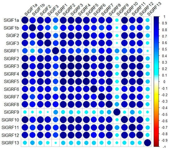 GIF1 interacts with GRF to regulate the expression of GRF in rice and Arabidopsis [,,,]. To further understand whether there is a regulatory relationship between the tomato GIF and GRF genes, the co-expression analyses between SlGIFs and SlGRFs were conducted. The expression profiles of SlGIFs and SlGRFs in different tissues were retrieved from the Tomato Functional Genomics Database (http://ted.bti.cornell.edu/). The expression levels of GIF and GRF genes from 536 samples (Table S3) in 18 transcriptome assays (Table S4) were employed for co-expression analysis between SlGIFs and SlGRFs. SlGRF13, SlGRF9, and SlGRF1 showed lower co-expression levels between the GIF genes (Figure 8). Among the four GIF genes, SlGIF1b recorded a lower co-expression level between GRF genes. The expression levels of SlGRF2, SlGRF3, SlGRF4 and SlGRF5 were highly correlated with SlGIF1a, SlGIF2, and SlGIF3. In summary, the expression levels of SlGIF1a, SlGIF2, and SlGIF3 had higher relationships with those of SlGRF2, SlGRF3, SlGRF4 and SlGRF5, suggesting regulatory relationships between these genes.