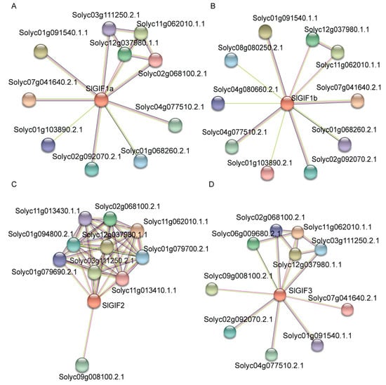 Predicted protein association networks analyses of SlGIF proteins: (A) SlGIF1a; (B) SlGIF1b; (C) SlGIF2; and (D) SlGIF3. The nodes represent the proteins, and the lines represent the protein–protein associations. Light blue and purple lines represent the known interactions from curated database or experimentally determined; green, red, and blue lines represent gene neighborhood, gene fusions, and gene co-occurrence, indicating the proteins are the predicted interactions; yellow, black, and light sky blue lines represent textiming, co-expression, and protein homology, respectively.
