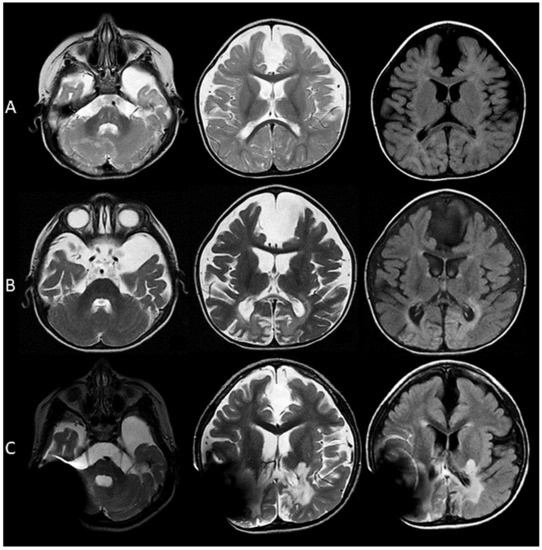 (A) At 10 months of age, a prominent subarachnoid space is evident, secondary to a mild degree of cortical atrophy, with a remarkable volume loss of the frontal and temporal operculum. The myelination for the age is adequate; also, interhemispheric and left temporal arachnoid cysts are seen. There is no diffusion restriction in the DWI (Diffusion-weighted Imagin) and ADC (Apparent Diffusion Coefficient) maps. (B) At 16 months of age, a marked generalized cortical atrophy is evident. In the T2-weighted and FLAIR images, areas of increased signal are observed predominantly in the deep white matter of the parietal and occipital lobes; also, gliotic changes are present bilaterally in the occipital poles. A compensatory ventriculomegaly is evident. There is no enhancement with gadolinium. (C) At 44 months of age, there is a large signal artifact which limits the observation of the right parietal, temporal, and occipital lobes, as well as the right cerebellar hemisphere. In the T2 and FLAIR images, there is an increased signal in the lateral aspect of thalamus bilaterally; the posterior arm of the internal capsules; the splenium of the corpus callosum; and again of the white matter of the temporal, parietal, and occipital lobes. Additionally, an increased signal is seen in the white matter of the left cerebellar hemisphere. A decreased volume of the brainstem is observed as well.