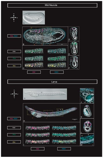 At mid-neurula stage, Adar and Adarb were co-expressed in the neural tube in Elav- and Prox1-positive cells (Figure 2C). Moreover, Adar and Prox1 colocalized in the proximal half of the somites (Figure 2E). In the larva Adar and Adarb were also co-expressed with Elav and Prox1 in the neural tube. However, while in the mid-neurula Adar genes were expressed exclusively in Elav- or Prox1-positive cells, at the larva stage several Elav- and Prox1-negative cells express one or both ADAR genes (Figure 2I). Additionally, in the mid-neurula and larva stage Adar and Prox1 were co-expressed in somites and muscles (Figure 2E,M).