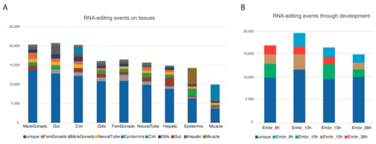 Putative RNA-editing events by tissue and developmental stage. (A) Number of putative RNA-editing within coding regions by tissue, specific for one or two of the available tissues. (B) Number of putative RNA-editing events within coding loci by developmental stage, specific for one or two of the available stages.