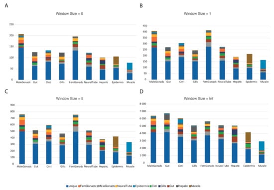 Putative orthologous RNA-editing events by tissue using the tested window sizes. Number of putative orthologous RNA-editing events by tissue, specific for one or two of the available tissues; each graph corresponds to one of the four window sizes analyzed: (A) Window size 0; (B) Window size = 1; (C) Window size = 5; (D) Window size = Infinite.