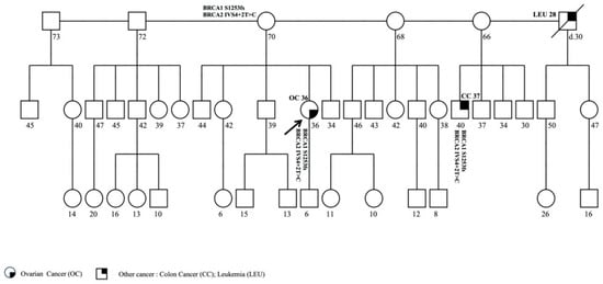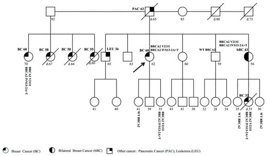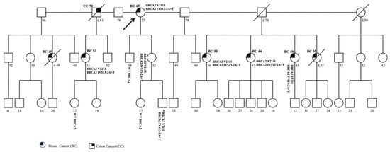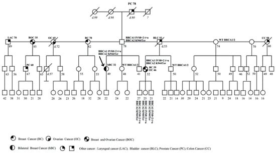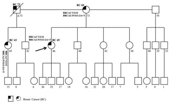 The patient with pathogenic variants c.547+2T>A (IVS8+2T>A) in BRCA1 and c.2830A>T (p.Lys944Ter) in BRCA2 has already been described []. After 2013, the mutation analysis was extended to other family members. The proband was a 49-year-old woman affected with bilateral BC. The patient referred other cases of tumors in her family (Figure 1).