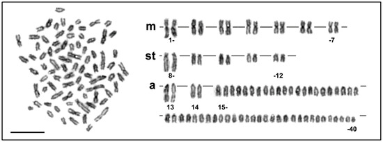 Giemsa stained metaphase plate and the corresponding karyotype of Salmo platycephalus. m, metacentric; st, subtelocentric; a, acrocentric chromosomes. Bar equals 10 µm.