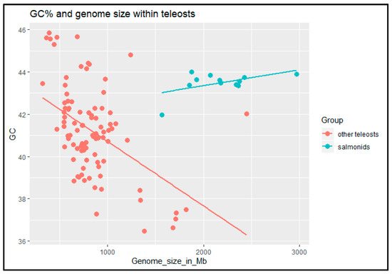 Finally, we have taken advantage of the increasingly available data on genomic features (GC% and genome size) among teleost fishes with a special focus on salmonids. Including more species than in the previous analysis [29] confirmed earlier results that genome size negatively correlates with the genomic GC% in fish excluding salmonids. Moreover, the results revealed an inverse relationship between these two measures in salmonids in comparison with other teleosts (Figure 4).