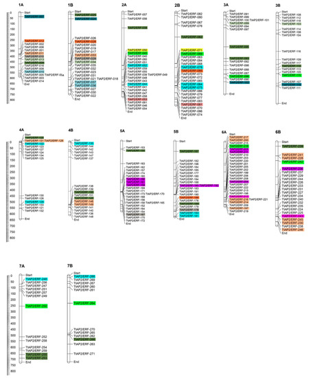 Chromosomal distribution of 271 non-redundant putative TtAP2/ERF genes predicted from the T. turgidum genome. The predicted duplicated pairs are highlighted in the same color.
