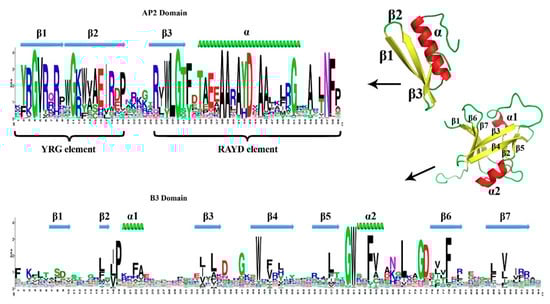 To analyze the conservation of the TtAP2/ERF proteins from different subfamilies, their specific AP2 (SM000380) and B3 (SM01019) domains were aligned to generate specific sequence logos (Figure 3). AP2 is characterized by two conserved regions called YRG and RAYD. As regards the AP2 domain, the structure prediction revealed three β-sheets (β1, β2, and β3) and one α-helix region that shared significant amino acid similarity within two YRG and RAYD elements (Figure 3). In particular, the amino acid residues 4G, 11G, 29L, 30G, 38A, 39A, 43D, and N57 were highly conserved among TtAP2s/ERFs. The structure of β-sheet 1 contained a conserved GVR element along with several sequences. Moreover, β-sheet 2 revealed a conserved EIR element with several substitutions, including 16H for 16E, 17V for 17I, and 18W for 18R. Our results suggested that the amino acid residues of EVR were present only in the ERF and DREB genes. In addition, β-sheet 3 revealed a conserved WLG element, which was highly conserved between T. durum and other species, such as Arabidopsis. Furthermore, the α-helix structure contained a consensus sequence (positions 38–43) AAxA[YH]D, which is highly conserved among the RAYD elements (Figure 3). The conserved Ala45, an important residue for binding to GCC-box and DRE cis-elements [14,66], was also fully conserved among all members of TtAP2s/ERFs. Moving to the B3 domain, characterized by seven β-sheets and two α-helices (Figure 3), the amino acid residues 19P, 36L, 38D, 41G, 44W, 60G, 61W, 64F, 65V, 70L, 73G, 74D, and 78F were highly conserved among all TtAP2s/RAVs (Figure 3). The N-terminal region of TtAP2/RAV proteins contained an AP2 DNA-binding domain, while a highly conserved B3 domain existed in the C-terminal region. The B3 domain comprised seven β-sheets and two α-helices (Figure 3).