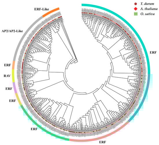 Phylogenetic analysis of AP2/ERF proteins from durum wheat, rice, and Arabidopsis using MEGA 6 software based on the NJ method.