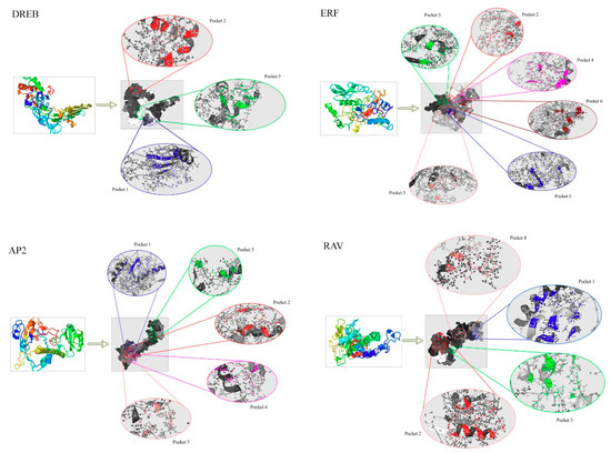 Topographic features of TtAP2/ERF proteins were assessed through the P2Rank program; the major pockets of which are presented here as multiple colored regions (Figure 6). Three, six, four, and five major pockets were predicted as binding regions/active sites in the candidate proteins from the DREB, ERF, RAV, and AP2 clusters, respectively. The amino acid residues present in the pocket sites of the TtAP2/ERF proteins partially differed in each subfamily, although Mg or Ca ions were present in the center of the active sites of all the predicted TtAP2/ERF protein models. SER, GLY, HIS, PRO, GLU, TYR, and ARG amino acids were identified as the important binding residues in the predicted pocket sites of the DREB and ERF proteins (Figure 6); these findings strongly indicate the potential roles of these proteins in the response to stress as well as growth and development modification in durum wheat. Investigations of the predicted pocket sites of RAV and AP2 family-related proteins also demonstrated some parts rich in the stress-responsive residues GLY, PRO, HIS, and SER as well as growth-regulating amino acids LEU, VAL, GLU, ALA, and TYR (Figure 6). Based on our results, the important amino acids found in the pocket sites of all the candidate TtAP2/ERF proteins may indicate the importance of these residues in the positioning onto the DNA molecule and, ultimately, the cellular function associated with various developmental and defensive processes.