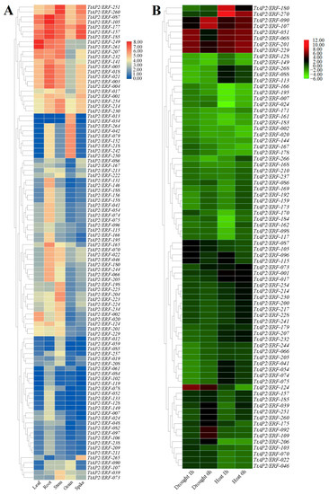 Expression heatmaps of putative TtAP2/ERF genes in five different tissues (namely leaf, root, stem, grain, and spike) of durum wheat (A) and under drought (1 and 6 h) and heat stresses (1 and 6 h) conditions (B).
