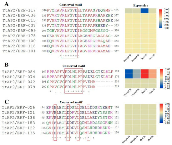 Protein sequences of TtAP2/ERF genes were screened to identify the repression motifs, [R/K]LFGV, FDLNLPP, and EDLL. The results showed that nine genes belonging to the RAV subfamily contain the [R/K]LFGV motif, most of which (except for TtAP2/ERF-117) were not induced in response to drought and heat stress (Figure 8A). Additionally, four proteins belonging to ERF subfamily had a FDLNLPP motif, and two genes of them, TtAP2/ERF-054 and TtAP2/ERF-074, were involved in early response to drought and heat stress (Figure 8B). Besides, motif EDLL was identified in six ERF proteins that were not expressed under drought and heat stress (Figure 8C).