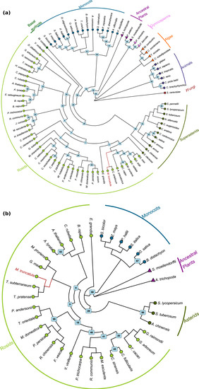 Phylogenetic tree constructed based on the (a) TDP1α and (b) TDP1β sequences. For TDP1α, 500 bootstrap maximum likelihood tree of 88 protein sequences was used while 36 protein sequences are representative for TDP1β. Bootstrap values are shown only if lower than 100. The different clades are marked with different point and bar colors. M. truncatula branch is highlighted in red.