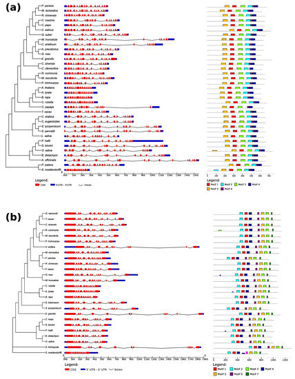 The specific genetic structure (exons, introns, and untranslated regions) was evaluated with Gene Structure Display Server (GSDS) (http://gsds.gao-lab.org/, [36]) only on a subset of selected representative species.