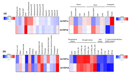 Expression profiles of the TDP1α and TDP1β genes in cereal crops. (a) O. sativa. (b) Z. mays. Expression data from different tissues and stress conditions are given in heatmaps generated based on Z-score values at http://shinyheatmap.com/.