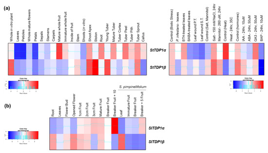 Less data are available for tomato plants. The data hereby retrieved come from the study of Koenig et al. [48] which deals with comparative transcriptomics in domesticated (S. lycopersicum var. M82) and wild tomato (e.g., S. pimpinellifolium), mainly related to the developmental context. The tested materials consisted of roots, leaves, flowers, young green fruits, and mature fruits collected from plants grown under greenhouse conditions. The generated heatmap (Figure 6b) shows that SlTDP1α (Solyc03g031820.2) most intense expression is in fruits whereas for SlTDP1β (Solyc03g117960.2) is mostly expressed in roots and flowers. Hence, the tissue-specific gene expression variation observed for potato plants is maintained in tomatoes as well.