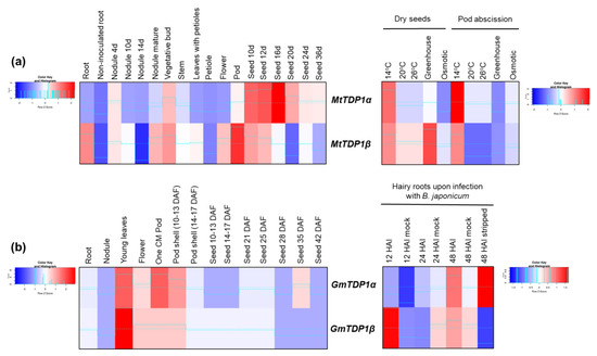 Within the Fabaceae family, we focused on M. truncatula (barrel medic), an important model species for legume research as well as a relevant forage crop for the Mediterranean and semi-arid areas, and G. max, widely grown for its edible beans (Figure 7). For M. truncatula, data regarding transcriptomics in all major organ systems were retrieved from Benedito et al. [44] while data on the effect of stress (temperature, osmotic) on dry seeds and during pod abscission were recovered from the study of Righetti et al. [45]. In the latter case, the imposed conditions were as follows: standard conditions (20/18 °C), low temperature (14/11 °C), high temperature (26/24 °C), osmotic stress (20/18 °C; −0.1 MPa), and greenhouse conditions (variable temperature and light). Within the different plant organs taken under consideration, MtTDP1α (Medtr7g050860) gene is highly expressed at the early stages of seed development, while MtTDP1β (Medtr8g095490) gene is most expressed in roots, mature nodules, vegetative buds, flowers, and pods (Figure 7a). As for the effects of stress, both genes are upregulated by cold and downregulated by osmotic conditions, especially in dry seeds.