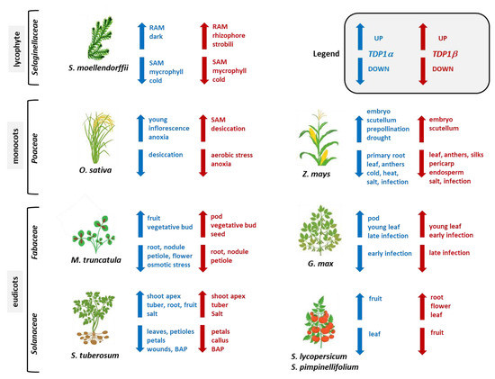 Schematic representation of TDP1α and TDP1β gene expression patterns in representative lycophytes, monocots, and dicots. TDP1α expression is given in blue while TDP1β is given in red. Arrows indicate increased or decreased accumulation, respectively.