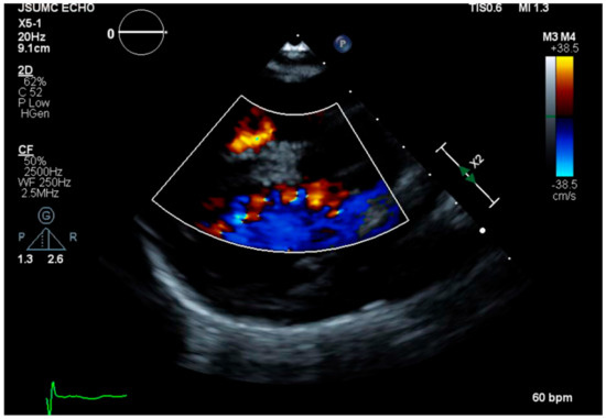 A 26-year-old woman with non-mosaic Edwards syndrome presented to the clinic for follow up after recent hospitalization for aspiration pneumonia. The definitive diagnosis of trisomy 18 was made prenatally utilizing chromosomal analysis and G-banding and fluorescence in situ hybridization (FISH) on cells obtained via amniocentesis. Her past medical history is characterized by severe growth and intellectual limitations, recurrent history of infections, especially respiratory system infections, and a ventricular septal defect (VSD) that was never surgically repaired. She has been in her usual state of health under the complete care of her mother for all daily living needs for the past seven years until recently, when she was found to be in respiratory distress and hypoxic (O2 saturation decreased to 77% on room air). She was admitted to the hospital and was diagnosed with and treated for aspiration pneumonia, from which she recovered and was discharged shortly after with significant improvement of her respiratory symptoms. While this was not her first episode of aspiration pneumonia, she was deemed inappropriate for gastrostomy tube placement during several previous hospitalizations. During the follow-up clinical visit, she was wheelchair bound, cheerful and able to mumble some verbal sounds, and in no acute distress. Her vital signs showed blood pressure of 104/64 mmHg, heart rate of 87 beats per minute, respiratory rate of 16 breaths per minute, and weight of 45 pounds. Physical examination revealed a small head, no occipital protuberance, low-set ears, small jaw, broad nasal bridge, and ocular hypertelorism; however, both vision and auditory acuity were intact. Chest examination revealed severe kyphoscoliosis; clear lungs upon auscultation; and a soft non-holosystolic murmur, best heard at the left lower sternal border. Abdominal examination showed soft abdomen, with positive bowel sounds and no palpable organomegaly. Extremities were well perfused with 2 + distal pulses. The hands were clenched, and palmar creases were normal. No clubbing, cyanosis, or rocker-bottom feet were noted. Echocardiogram was only remarkable for a small muscular VSD with left to right shunting (Figure 1). Laboratory results were unremarkable on follow-up, including any significant hematological, renal, or liver impairment.