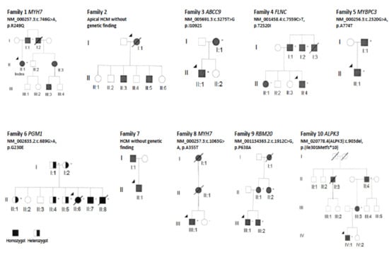 In family 10, the trio exome analysis revealed a heterozygous variant in the ALPK3 gene in all family members with severe hypertrophy. ALPK3, was first described only for pediatric recessive CM caused by homozygous truncating mutations []. There were only 2 of 10 heterozygous family members in previously described cases that showed hypertrophy and with an atypical distribution of hypertrophy []. Additionally, in a recent study [], the first case of symptomatic ALPK3-associated cardiomyopathy presenting in adulthood is reported, leading to cardiac transplantation 10 years after the presentation of symptoms. This patient, though, carried a homozygous nonsynonymous single-nucleotide variant in exon 10 of ALPK3, underscoring the variability of symptoms and onset of disease that is seen in cases of cardiomyopathy caused by biallelic variants in ALPK3. On the contrary, Cheawsamoot et al. [] have very recently reported that a monoallelic ALPK3 variant can cause adult-onset HCM with a penetrance of 70% in a Thai family with 18 individuals, seven of whom had an adult onset HCM. In all seven affected and three unaffected members a heterozygous variant in ALPK3 was identified. Our study also suggests that heterozygous variants of ALPK3 (which was not included in the CM panel) can cause autosomal dominant HCM. Accordingly, ALPK3 ought to be included in HCM gene panels.