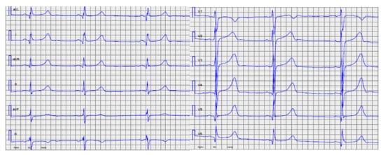 Family 10: The index patient fainted during sports activity at 14 years of age. It was attributed to a vasovagal syncope episode, totally missing the obvious signs of LVH on the ECG (Figure 4). He presented at age 24 with renal disease. Perioperative ECG changes were observed on the monitor that led to further cardiological assessment. The echocardiogram revealed myocardial hypertrophy, mainly comprising the midventricular septum, measuring 28 mm with an LVEF of 50% without any signs of outflow obstruction. In the family history, his mother had HCM diagnosed incidentally at age 42. The brother of the maternal grandfather died suddenly at the age of 56 without previous cardiac symptoms. The grandfather was clinically screened at age 54, where the echocardiogram depicted a severely hypertrophied septum up to 30 mm. Holter revealed several episodes with non-sustained VT, leading to an ICD implantation. Our index patient is also planned to receive an ICD as he has had several episodes of non-sustained VT on the holter monitor. The mother underwent the CM 60 gene panel test in 2015 and our index in 2019 without finding any pathogenic variants. Trio-exome unraveled the likely cause of the HCM in this family when a heterozygous variant in ALPK3 (Chr15:85370829 NM_020778.4:c.903delC) gene was detected [] considered as “likely pathogenic” according to ACMGs guidelines. This variant was found in our index, his mother, and his grandfather, segregating with the disease.