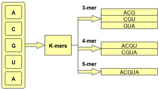 To better illustrate the process of generating overlapping k-mers, consider a hypothetical sequence ACGUACGUCGU. As is shown by the Figure 1, for base sequence ACGUACGUCGU, different k-mers are generated using 3, 4, and 5 g with the stride size of 1.