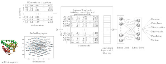 In natural language processing, following the success of transformer [45]-based approaches, here, for the first time, we capture the positional information of k-mers from miRNA sequences and fuse this positional information in randomly initializing k-mer embeddings. Furthermore, we use a one-dimensional convolutional layer for the extraction of discriminative features from k-mers of miRNA sequences. As miRNA sequences are very small in size, discriminative features extracted by the convolutional layer along with neural embedding features are concatenated before passing to two fully connected layers. The final fully connected layer is used as a classifier for the prediction of various locations associated with the miRNA sequences. Figure 2 shows a graphical representation of the proposed MirLocPredictor methodology. Subsequent sections briefly describe the main modules of miRNA subcellular localization methodology.