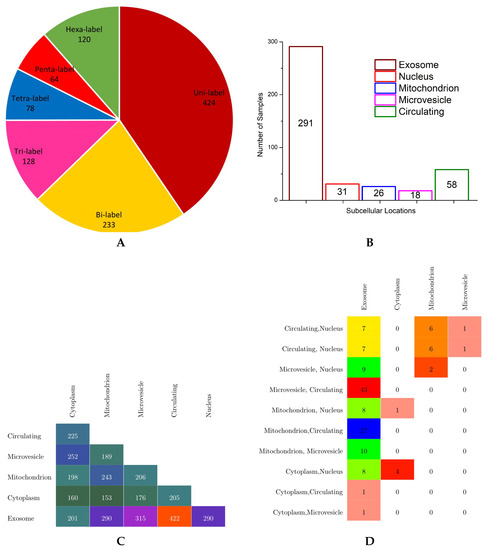 Among all 421 miRNA sequences, uni-label, bi-label, tri-label, tetra-label, penta-label, and hexa-label have 424, 233, 128, 78, 64, and 120 samples, respectively. Turning towards the sequences of each class, the exosome and circulating classes have the most samples, 106 in total, followed by 39 samples of exosome and microvesicle, 34 samples of exosome and nucleus, and 23 samples of exosome and mitochondrion.