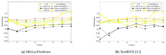 As is shown by Figure 5, in terms of evaluation measure, both classification models perform better with the proposed kmerPR2vec feature representation approach by marking the higher performance almost across all k-mers. Randomly initialized k-mer embedding only manages to equalize the promising performance of the proposed kmerPR2vec twice (k-mers 5 and 7) with MirLocPredictor and thrice (k-mers 5–7) with adapted TextRNN. Likewise, taking F1 variants into account (micro and macro), although the performance of MirLocPredictor computed using the proposed kmerPR2vec feature representation approach initially remains close to the performance produced by randomly initialized neural k-mer embeddings until 4-mers as compared to 5-mers for TextRNN, afterwards, the proposed feature representation approach significantly increases the performance of both classification methodologies. Just like F1-score, average precision produced using the proposed kmerPR2vec feature representation approach remains very high in the majority of k-mers for both the MirLocPredictor and TextRNN methodologies.