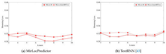 On the other hand, as shown by Figure 6, evaluating the performance of both classification methodologies in terms of hamming loss, MirLocPredictor hamming loss using the proposed kmerPR2vec feature representation approach is significantly lower across all k-mers than the hamming loss produced using random initialized k-mer vectors. Whereas TextRNN produces same hamming loss values with both feature representation approaches only at two k-mers (3 and 7), at most k-mers, TextRNN hamming loss using the proposed kmerPR2vec feature representation approach also remains lower than the hamming loss produced by randomly initialized k-mer embeddings.