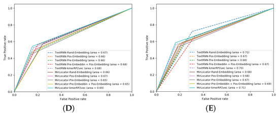 Area Under the Receiver Operating Characteristic (AUROC) graphs of the proposed MirLocPredictor and TextRNN using 5 different representation schemes over 5 folds: (A) fold 1, (B) fold 2, (C) fold 3, (D) fold 4, and (E) fold 5.