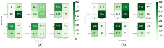 Furthermore, to illustrate the effectiveness of MirLocPredictor over TextRNN by comparing the performance at class level, accuracy confusion matrices for both approaches using the proposed kmerPR2vec are created. We consider the one vs all strategy to create confusion matrices where each subcellular location acts as a positive class and other subcellular locations act as negatives. Moreover, for each confusion matrix, true positives, false positives, true negatives, and false negatives are computed by considering the total appearance of one particular subcellular location in the settings of one versus all.