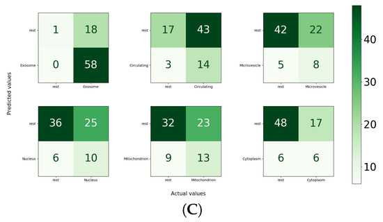 For the independent test set, in the paradigm of the one versus all strategy, the performance of MirLocPredictor is illustrated in Figure 8C. Subcellular location exosome appeared the most, with a total of 58 times, alone or with any other subcellular location. It is evident from the accuracy confusion matrix presented in Figure 8 that MirLocPredictor manages to accurately detect all 58 occurences of exosome. Likewise, from 17 appearances of the circulating class, it accurately identifies the presence of circulating locations in miRNA sequences most of the times. Other subcellular locations such as mitochondrion, microvesicle, cytoplasm, and nucleus have a total of 22, 13, 12, and 1 occurrences in the test set, respectively. Few appearances of these subcellular locations are accurately identified.