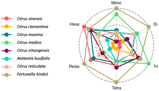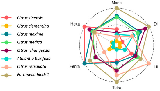 In all the species, mono-nucleotide repeats were most abundant, followed by di-, tri-, tetra-, penta-, and hexa-nucleotide repeats. Among all the citrus species, the maximum number of mono-nucleotide repeats was found in Fortunella hindsii (152,611) followed by C. ichangensis (144,115), C. maxima (142,446), A. buxifolia (129,304), C. medica (125,467), C. reticulata (123,469), C. sinensis (121,051), and C. clementina (115,888). In the case of di-nucleotide repeats, the maximum number was observed in F. hindsii (61,408) followed by C. medica (60,040), C. ichangensis (57,930), C. maxima (57,059), C. reticulata (55,336), C. sinensis (54,874), A. buxifolia (51,030), and C. clementina (50,108). The occurrence of tri-nucleotides was observed highest in C. sinensis (23,568) followed by F. hindsii (22,143), C. maxima (21,668), C. medica (21,259), C. ichangensis (21,149), A. buxifolia (20,572), C. reticulata (19,400), and C. clementina (18,553). Similarly, tetra-nucleotides were most frequent in F. hindsii (3159) followed by C. sinensis (3050), C. medica (2975), C. maxima (2954), C. ichangensis (2844), A. buxifolia (2822), C. reticulata (2631), and C. clementina (2620). C. ichangensis (613) and A. buxifolia (613) contain the maximum penta-nucleotides, followed by F. hindsii (576), C. maxima (539), C. medica (534), C. sinensis (473), C. clementina (436), and C. reticulata (408). Hexa-nucleotides were most abundant in A. buxifolia (346) followed by C. medica (315), C. ichangensis (299), C. maxima (295), F. hindsii (285), C. sinensis (281), C. clementina (173), and C. reticulata (164) (Table 3, Figure 2). From these results, a high abundance of mono-nucleotide repeats was observed in all the genomes, which may be due to the intrinsic limitation of the chemistry of next-generation sequencing (NGS) technology used for data generation [51]. Similarly, di-nucleotide repeats in higher abundance have also been reported in other crops [52,53].