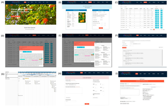 The main functions of the citSATdb database and search modules. (A) Home page; (B) species search page; (C) results page showing the desired search results; (D) results page displaying SSR and corresponding primers in sequence; (E) sequence of primers and their features; (F) ePCR results page; (G) JBrowse for visualization of markers on genome; (H) miSATminer tool for SSR prediction; and (I) BLAST search page.