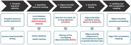 To date, the most commonly used FISH probes to anchor genome sequences to chromosomes have been bacterial artificial chromosome (BAC) clones as they carry inserts long enough for proper visualization of hybridization signals [26]. In plants with relatively complex genomes, the utility of BAC clones in cross-species comparative studies is limited, mainly due to the abundance of dispersed repetitive sequences in the clones. Thus, probes prepared from unique, single-copy sequences are more useful. However, the limiting factor of the use of single-copy sequences as FISH probes was the scarce availability of repeat-free, unique DNA clones, especially in non-model species with non-sequenced genomes. A significant breakthrough has been achieved recently by the innovations in synthesis and labeling of synthetic oligonucleotides, followed by the release of a publicly available software pipeline (Chorus), which together facilitate the development of locus-specific probes for FISH in a cost-effective manner [28,29]. The identification of large numbers of short (usually 45–50 bp), unique sequences across the whole genome assembly is done by the Chorus software, which enables advanced automation of this process. [29]. Designed oligonucleotides are then massively synthesized, labeled, and divided into pools, ready to use as probes for FISH. The oligo-based approach requires the availability of high-quality genome sequence for the oligonucleotide development, carrying also the representatives of the repetitive fraction of the genome. However, despite the rapid development of DNA sequencing techniques and genome sequence assembly algorithms, genomes of many species are not yet available. A solution may be to design probes using genome assembly from a closely related species, which may allow obtaining ‘universal’ probes that can be used in related species for heterologous hybridization. The ‘oligo-painting’ FISH provides an opportunity for a very precise cross-species analysis of chromosomal rearrangements [28]. The oligo-based technique in the last few years has proven to be effective in karyotyping and chromosome rearrangements identification in Cucumis, Fragaria, Solanum, or Musa species [29,30,31,32].