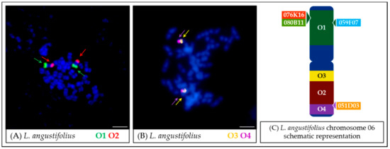 - In L. cosentinii (Figure 6 and Figure 8), hybridization of both O2 and O4 to two different chromosomes, as well as the highest number of probes (BACs and oligonucleotides) dispersed on multiple loci, might be the result of duplication and/or translocation of the arm B fragment of Lang06 chromosome (containing O1 and O2 probes) to Lcos06′ chromosome.