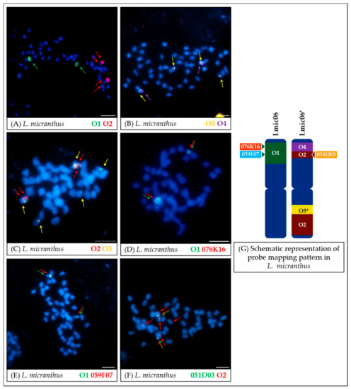 FISH mapping of oligonucleotide probes (A–C) and oligonucleotide probes combined with BAC clones (D–F) on mitotic chromosomes of L. micranthus. The positions of individual probes are marked by arrows. Probe colors are as follows: green (O1, Lang06 arm A), red (O2, Lang06 arm B), yellow (O3, pericentromeric region of Lang06 arm B), and purple (O4, telomere region of Lang06 arm B). Scale bar: 5 μm. Schematic representation of probe mapping pattern in L. micranthus chromosomes (G), showing observed positions of particular oligonucleotide-based or BAC-based probes, was not drawn to scale. O3*—beside two major loci, minor signals were also noticed.