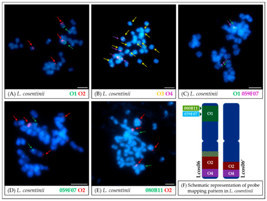 The intensity of oligo-FISH signals was noticeably weaker in L. cosentinii. The specificity of the O1 probe to the arm A of the Lcos06 chromosome was preserved, whereas both O2 and O4 probes hybridized to two loci, the first localized in the arm B of the same chromosome as the O1 probe (Lcos06) and the second in a different chromosome (Lcos06′) (Figure 6A,B). The O3 probe revealed signals dispersed over multiple loci on L. cosentinii chromosomes. To confirm the results of oligo-FISH, combinations of selected BAC clones with oligonucleotide probes were analyzed. These experiments showed that clone 059F07 shared the locus with the O1 probe (Figure 6C). Both 059F07 and 080B11 shared the chromosome (Lcos06) with the O2 probe (Figure 6D,E). Other BAC clones (051D03, 076K16) hybridized to multiple loci.