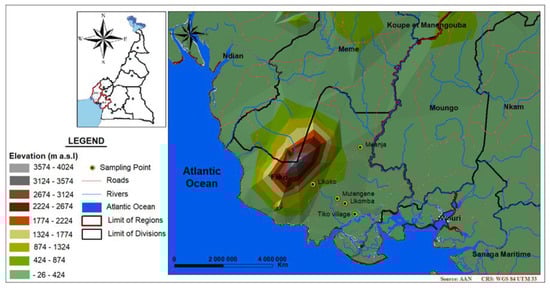 Mount Cameroon is the highest active volcano in western Africa, rising from the Atlantic Ocean at the Gulf of Guinea to an elevation of 4095 m a.s.l. The study was conducted in low, mid and high altitude areas within the lowland rain forest from sea level to 800 m elevation across the Mount Cameroon area (precisely in the Fako division, southwest region of Cameroon), having different landscape and environmental patterns [33]. Entomological surveys were restricted at this altitudinal range (from sea level to 800 m a.s.l.) due to previous surveys where the absence of Anopheles mosquitoes above 800 m elevation (precisely in the localities of Bokova and Bonakanda, situated between 800 and 870 m a.s.l.) was reported during four consecutive seasons [34].